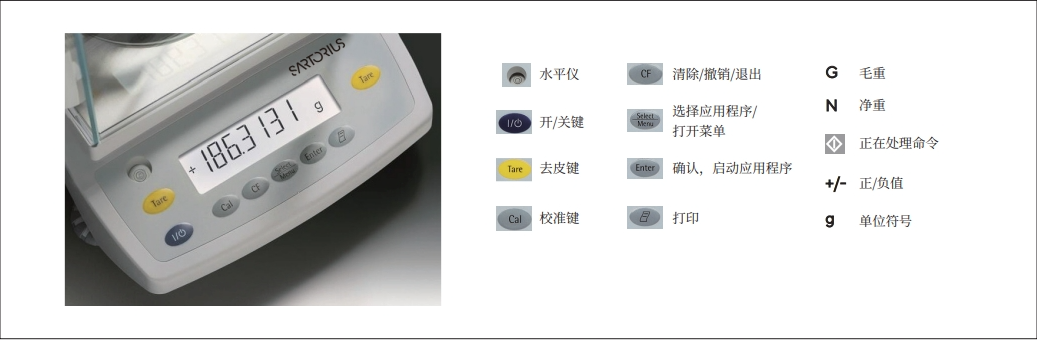 - 【注:BSA 系列天平內(nèi)置多種應(yīng)用程序,如稱重、密度測定、百分比、計數(shù)、不穩(wěn)定條 件稱量(動物稱量)、凈重 - 總重、求和、系數(shù)換算、稱量單位切換等,用戶可以根據(jù) 需要在菜單中選擇所需程序,并按提示進(jìn)行進(jìn)一步操作!