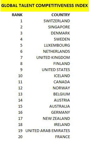 《全球人才競爭力指數(shù)》(the Global Talent Competitiveness Index)針對全球 103 個(gè)國家,涵蓋人口占世界人口 86.3%。研究顯示,瑞士排行榜首,新加坡獲得第二名,丹麥獲得第三名。亞洲國家中,日本排列第21名,韓國第28名。盡管中國是全球第二個(gè)最重要的經(jīng)濟(jì)體,卻排行第47名。