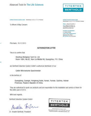 德國(guó)伯赫Titertek Berthold是一家擁有35年歷史的著名生命科學(xué)儀器制造廠商,是專注于樣品處理、自動(dòng)工作站和樣品檢測(cè)的高科技公司。總部和研發(fā)生產(chǎn)基地設(shè)在美國(guó)Huntsville和德國(guó)Pforzheim。2011年德國(guó)伯赫Titertek-Berthold公司并推出一款新型超微量分光光度計(jì)-Colibri,2013年廣州市深華生物技術(shù)有限公司正式成為德國(guó)Norllu伯赫公司超微量分光光度計(jì)南方區(qū)總代理。