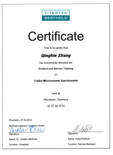 在4月份廣州市深華生物技術(shù)有限公司在總經(jīng)理張清杰的帶領(lǐng)下一行三人參加了第24屆Analytica 2014德國(guó)慕尼黑實(shí)驗(yàn)室分析生化儀器展。在德國(guó)伯赫公司的工廠接受了產(chǎn)品培訓(xùn),(Titertek Berthold是一家擁有35年歷史的著名生命科學(xué)儀器制造廠商,是專注于樣品處理、自動(dòng)工作站和樣品檢測(cè)的高科技公司,總部和研發(fā)生產(chǎn)基地設(shè)在美國(guó)Huntsville和德國(guó)Pforzheim),廣州深華公司也成功獲得德國(guó)伯赫Titertek Berthold產(chǎn)品售后培訓(xùn)資格證書。