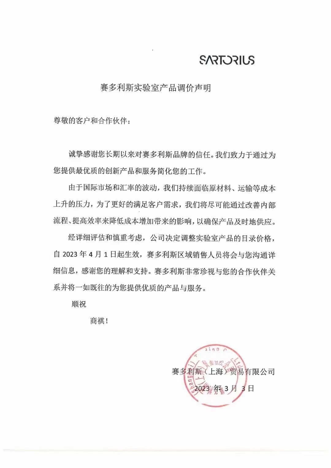 誠摯感謝您長期以來對賽多利斯品牌的信任。我們致力于通過為您提供最優(yōu)質(zhì)的創(chuàng)新產(chǎn)品和服務簡化您的工作。由于國際市場和匯率的波動,我們持續(xù)面臨原材料、運輸?shù)瘸杀旧仙膲毫,為了更好的滿足客戶需求,我們將盡可能通過改善內(nèi)部流程、提高效率來降低成本增加帶來的影響,以確保產(chǎn)品及時地供應經(jīng)詳細評估和慎重考慮,公司決定調(diào)整實驗室產(chǎn)品的目錄價格自2023年4月1日起生效,賽多利斯區(qū)域銷售人員將會與您溝通詳細信息,感謝您的理解和支持。賽多利斯非常珍視與您的合作伙伴關系并將一如既往的為您提供優(yōu)質(zhì)的產(chǎn)品與服務。順祝商祺!