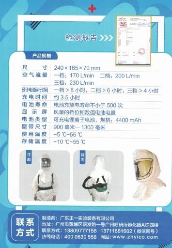 廣東正一生產(chǎn)的該產(chǎn)品(ZH2002)是一款正壓式電動(dòng)送風(fēng)呼吸器。產(chǎn)品主機(jī)包含頭罩、送風(fēng)機(jī)